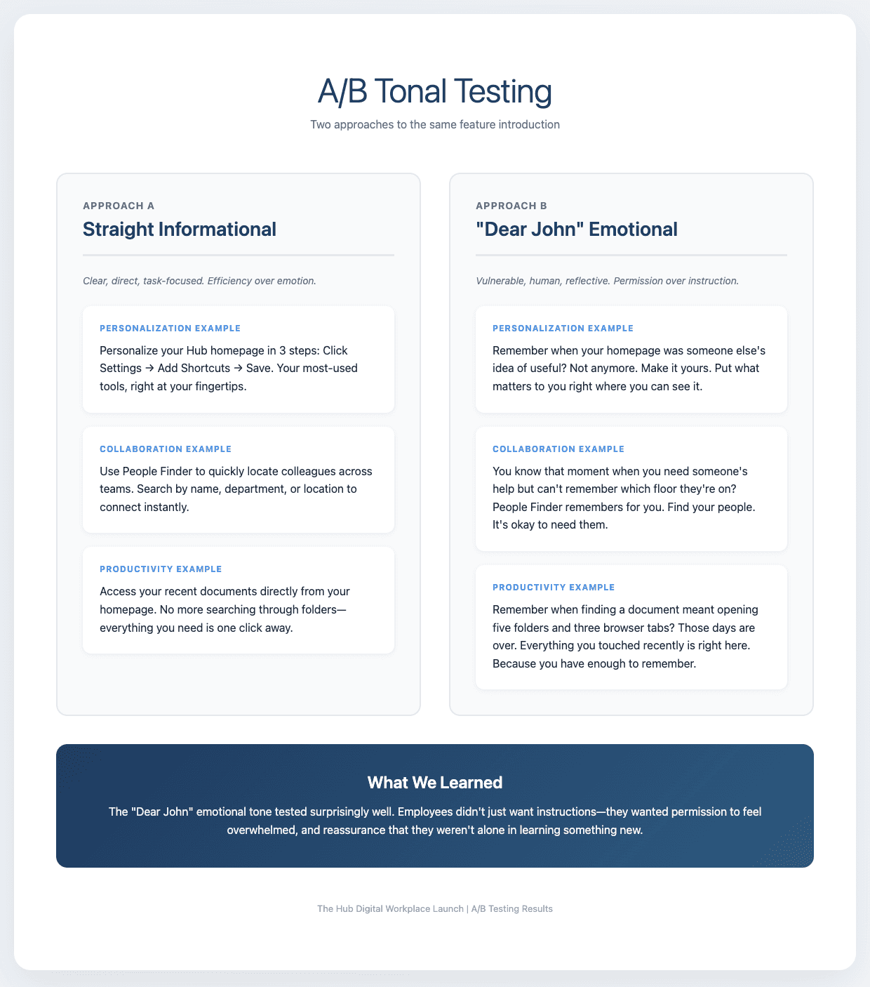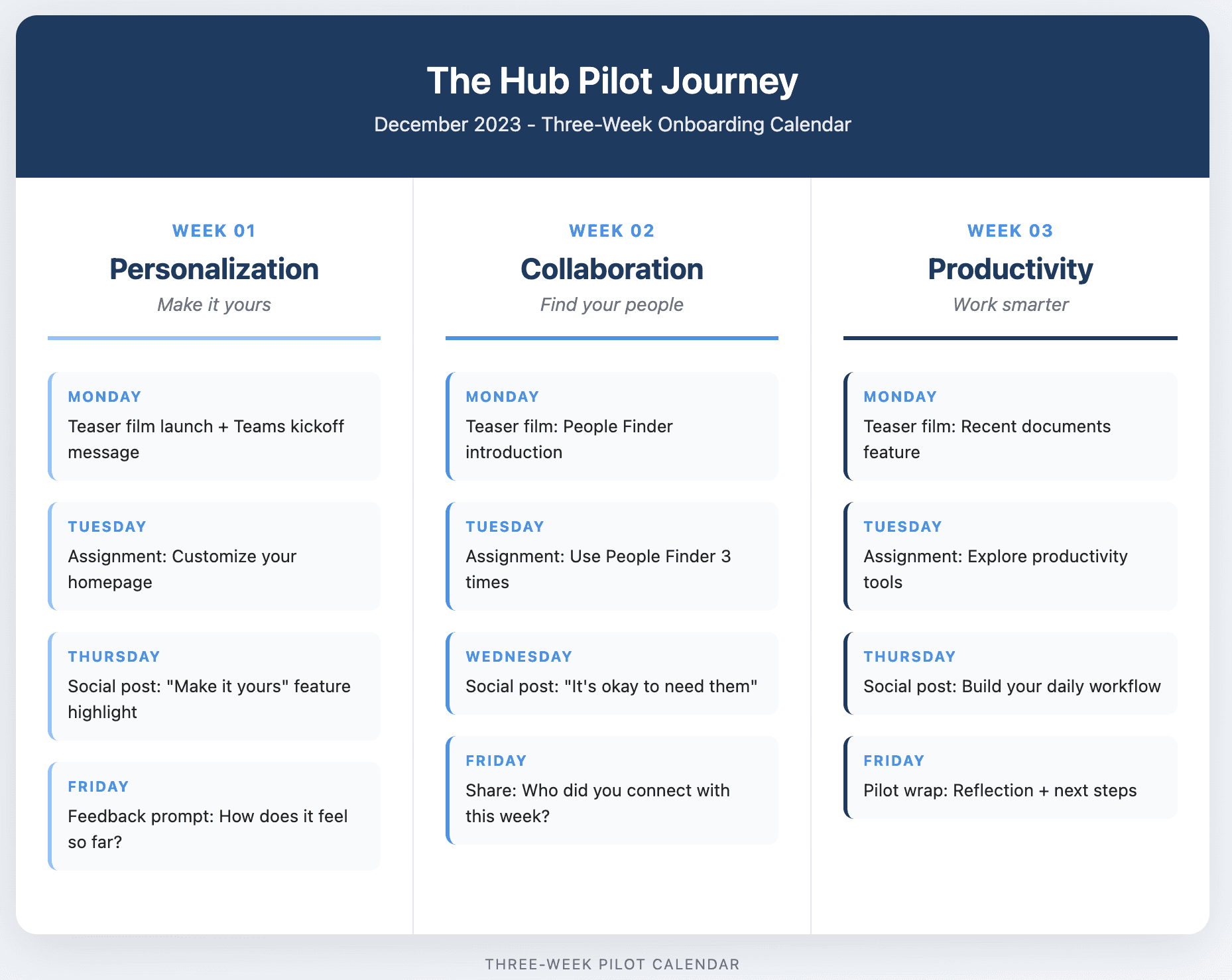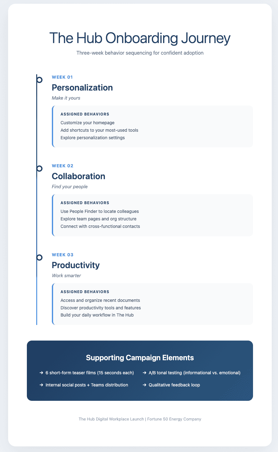 The company was rolling out a new digital workplace portal intended to streamline communication, navigation, personalization, and cross-functional collaboration. Employees were accustomed to legacy tools and required confidence, clarity, and meaningful onboarding to drive early adoption.