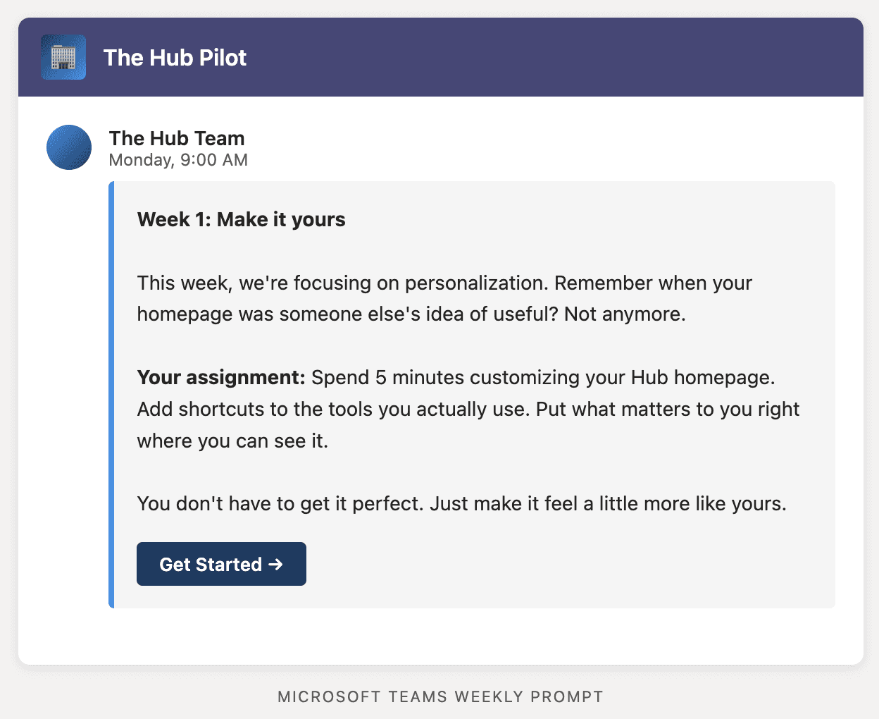 - Weekly behavior assignments (personalize portal, use People Finder, explore recent documents)