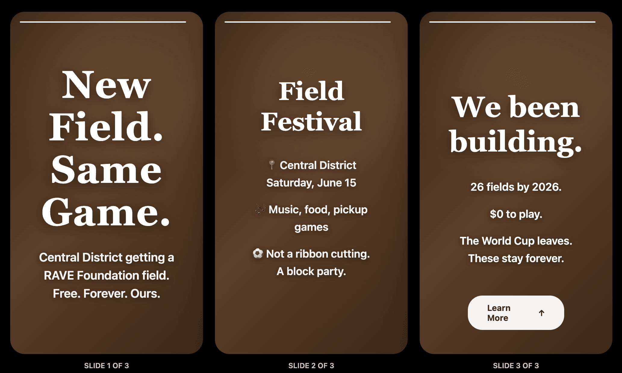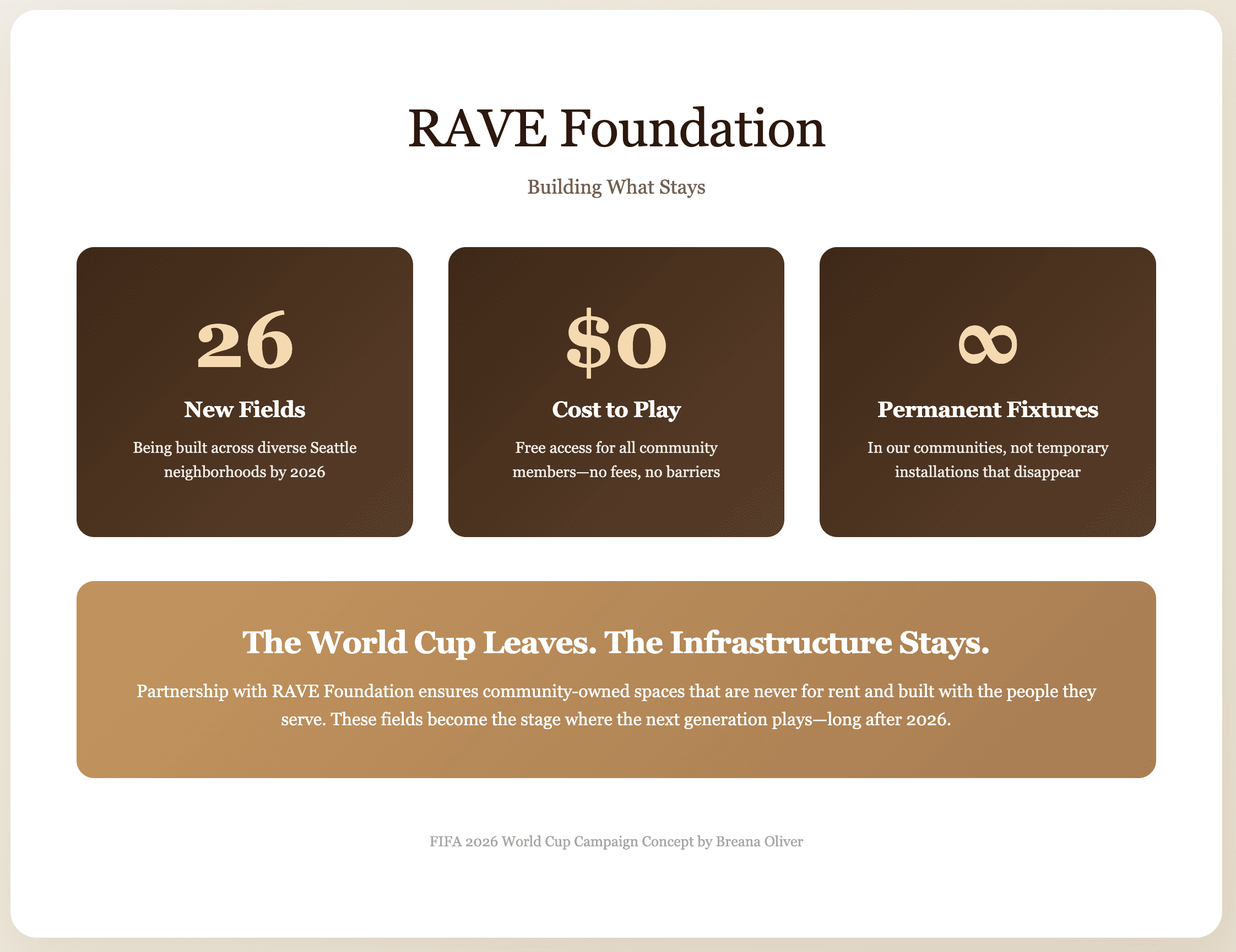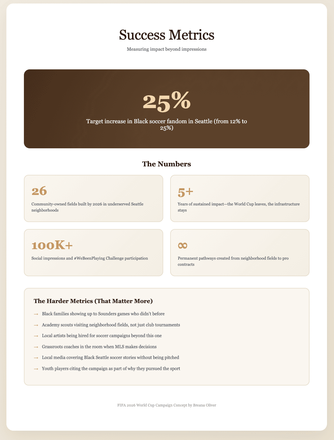 Creates permanent infrastructure that outlasts the event—26 fields that stay in communities forever
